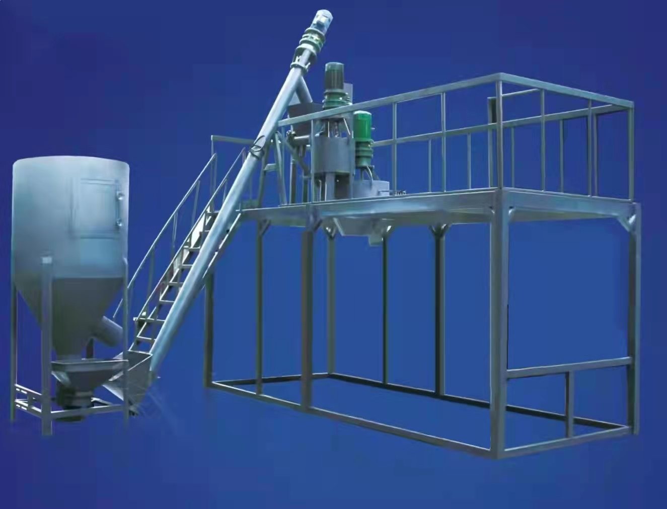 Эта система отличается рациональной конструкцией и высокой степенью автоматизации, сокращая потребность в рабочей силе на 1–2 рабочих по сравнению со стандартным оборудованием, тем самым снижая производственные затраты и повышая эффективность производства. Расположенная в Т-образной конфигурации, система компактна и включает в себя автоматический смеситель влажного порошка, который подает эмульсию и воду в смесительный бак в соответствии с заданными весовыми соотношениями. После смешивания в течение установленного времени суспензия автоматически выпускается из бака в накопительную емкость. После дополнительного перемешивания оператор открывает клапан, который подает смесь на конвейер, который доставляет ее к машине для нанесения раствора на EPS.
